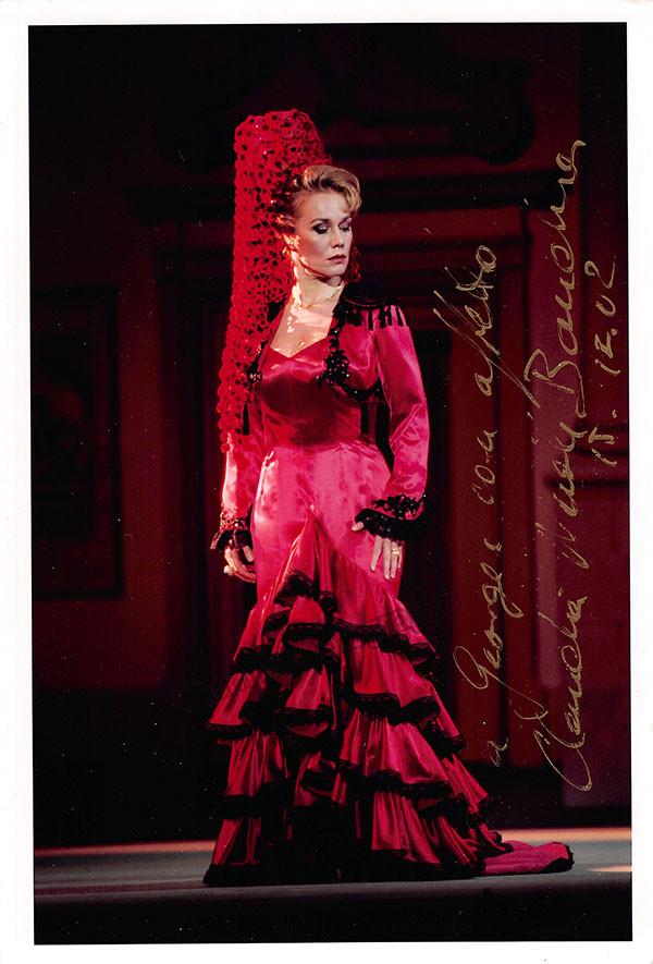 Italian mezzo-soprano, signed photo, shown in the title role in Carmen. Inscribed and dated in 2002. Size is 5 x 7.5 inches.