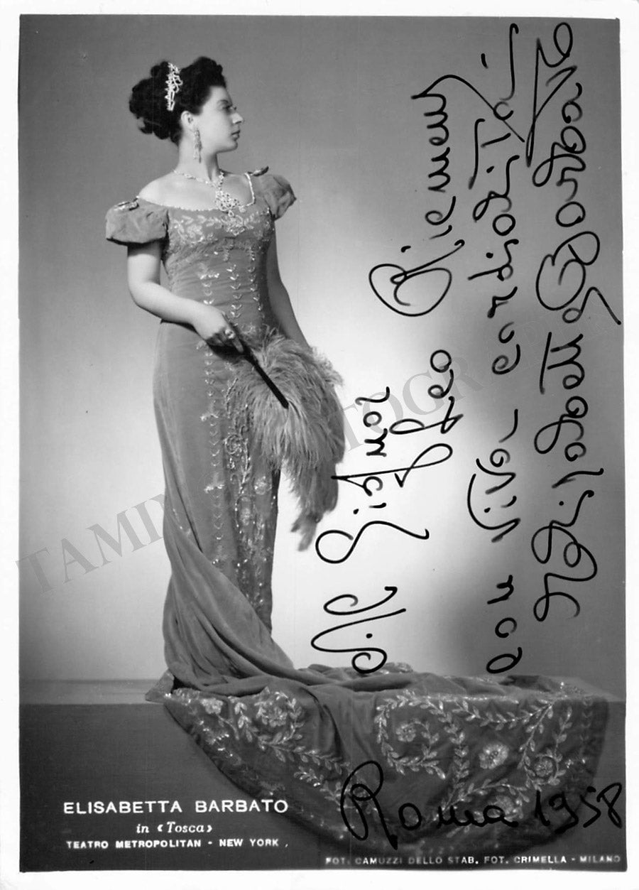 Signed photograph, shown as Leonora in Verdi's La Forza del Destino, inscribed in Buenos Aires and dated in 1950. Photo by M. Camuzzi, La Scala, Milan. Size is 4 x 6 inches, small crease on top right, otherwise in excellent condition.