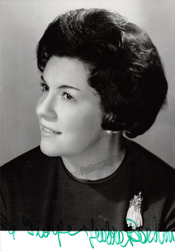Nice color photograph signed by her in 1983, shown as Margarita in Wolf-Ferrari's opera I Quattro Rusteghi at Teatro G. Verdi, Trieste; ink-stamped by Foto de Rota (Trieste). Size is 5 x 7 inches, in excellent condition.
