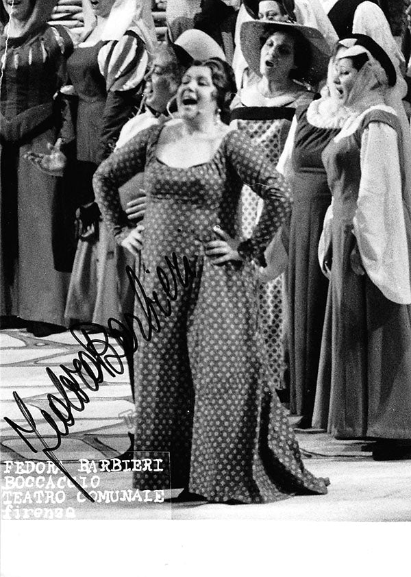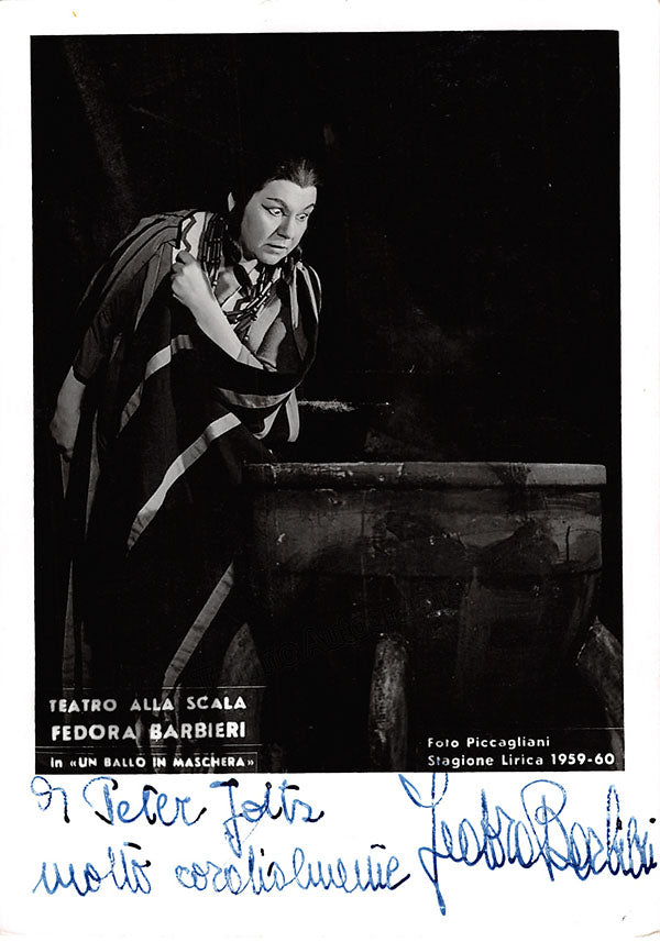 Black-and-white promo photograph by Erio Piccagliani signed and inscribed by Barbieri with a short sentiment in Italian, shown as Ulrica in Verdi's Un Ballo in Maschera at Teatro alla Scala, Season 1959-1960. Size is 4.1 x 5.75 inches, in excellent condition.