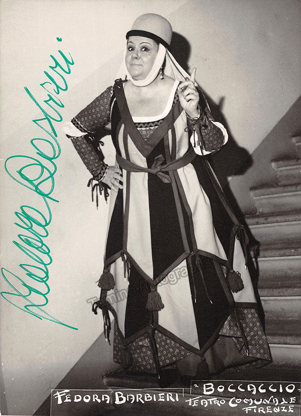 Nice black-and-white photograph signed by her, shown on stage probably as Peronella in von Suppé's opera Boccaccio at Teatro Comunale di Firenze; ink-stamped on verso by photographer Marchiori (Florence). Size is 4 x 5.6 inches, in excellent condition