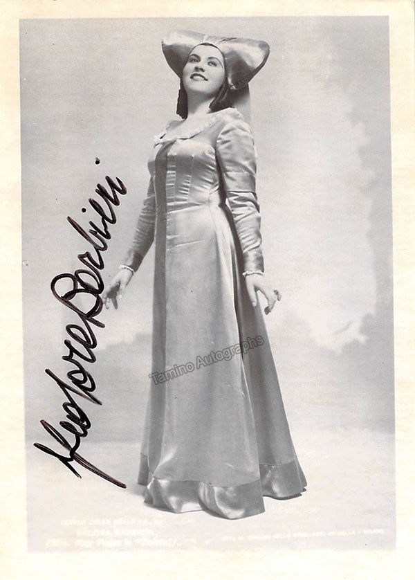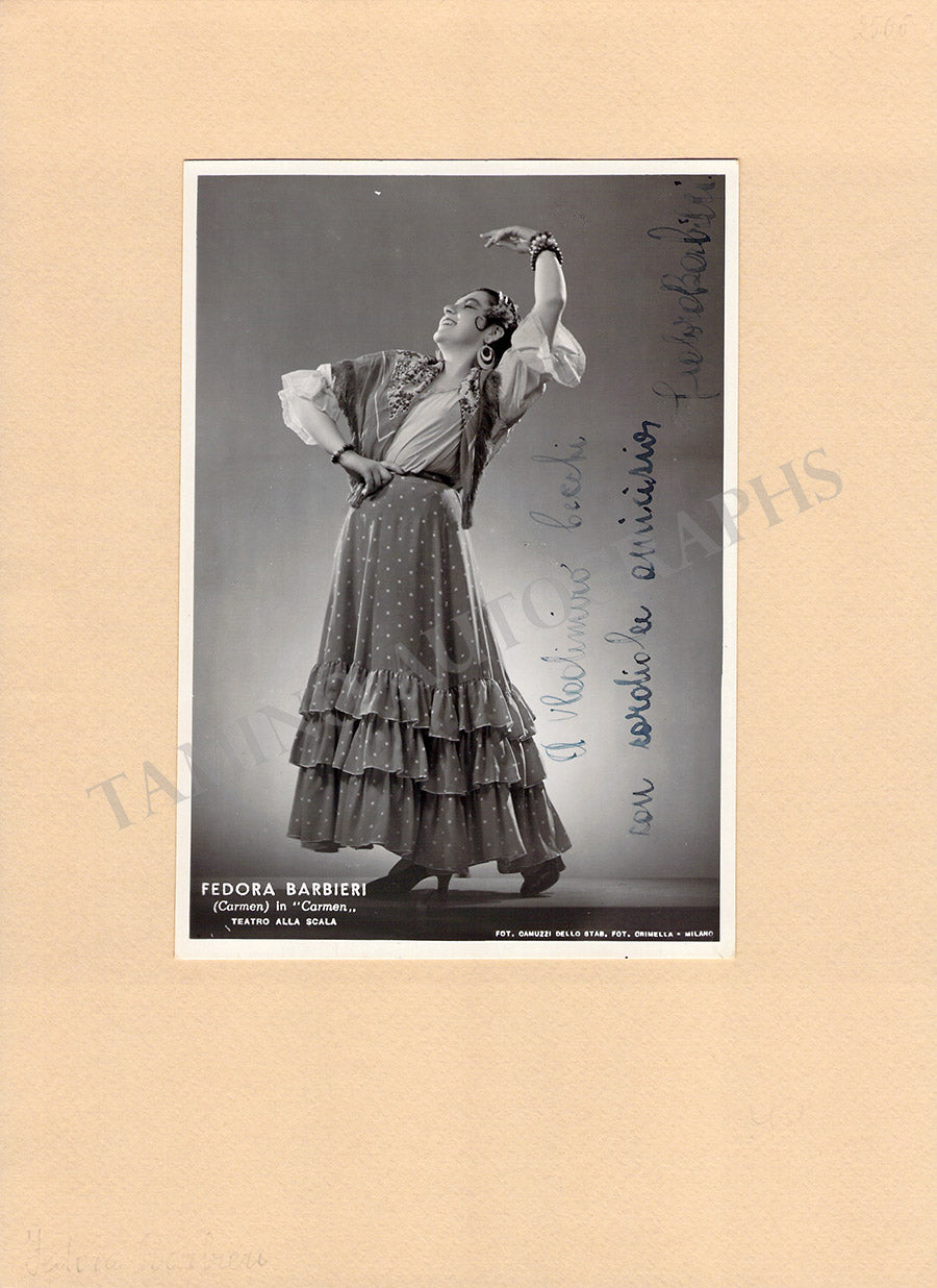 Signed photograph, shown in the title role of Bizet's Carmen, inscribed and dated in 1947. Photo by M. Camuzzi, La Scala, Milan. Size is 4.5 x 7 inches, several very small creases on bottom corners, otherwise in excellent condition.
