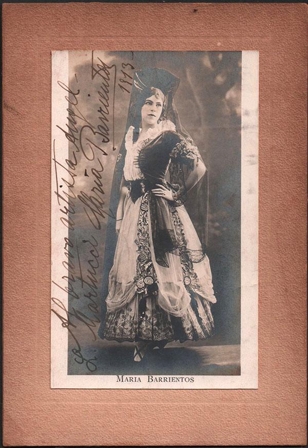 Spanish coloratura soprano (1883-1946), very famous in her time. Great signed photo postcard, shown in the title role in Carmen, inscribed, dated in 1913. Size of postcard is 3.5 x 5.5 inches affixed to solid cardboard backing, total item is 5 x 7 inches, beautifully preserved in excellent condition!