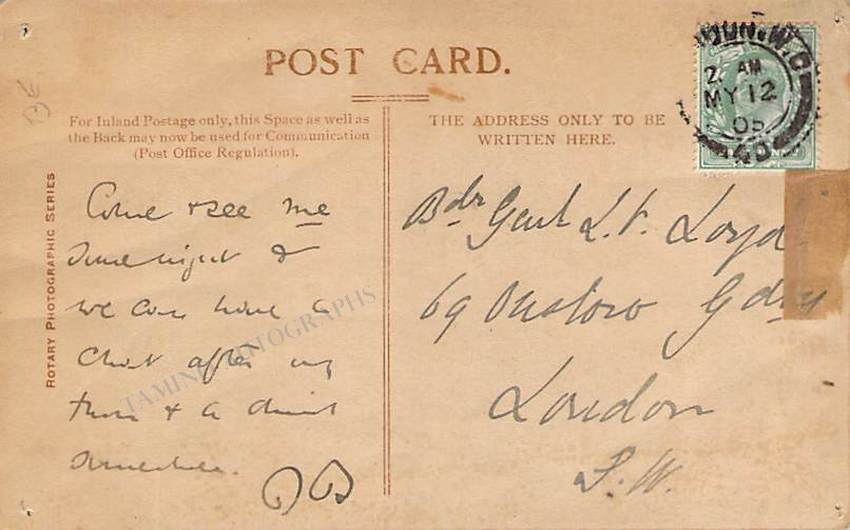 Signed photo postcard with an inscription on verso, shown in role.  Photo by Rotary Photographic Company. Size is 3.4 x 5.3 inches, some paper loss on the bottom left and wear on edges but otherwise in good condition.