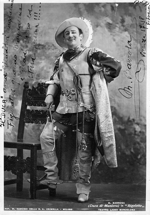 Spanish tenor (1904-1996), signed photo postcard, shown as the Duke of Mantua in Verdi's Rigoletto at the Teatro Liceo, Barcelona, dated in 1940. Inscription with sentiment. Photo by M. Camuzzi, Milan. Size is 4.1 x 5.9 inches, some wear on edges and mounting traces on verso but otherwise in very good condition.