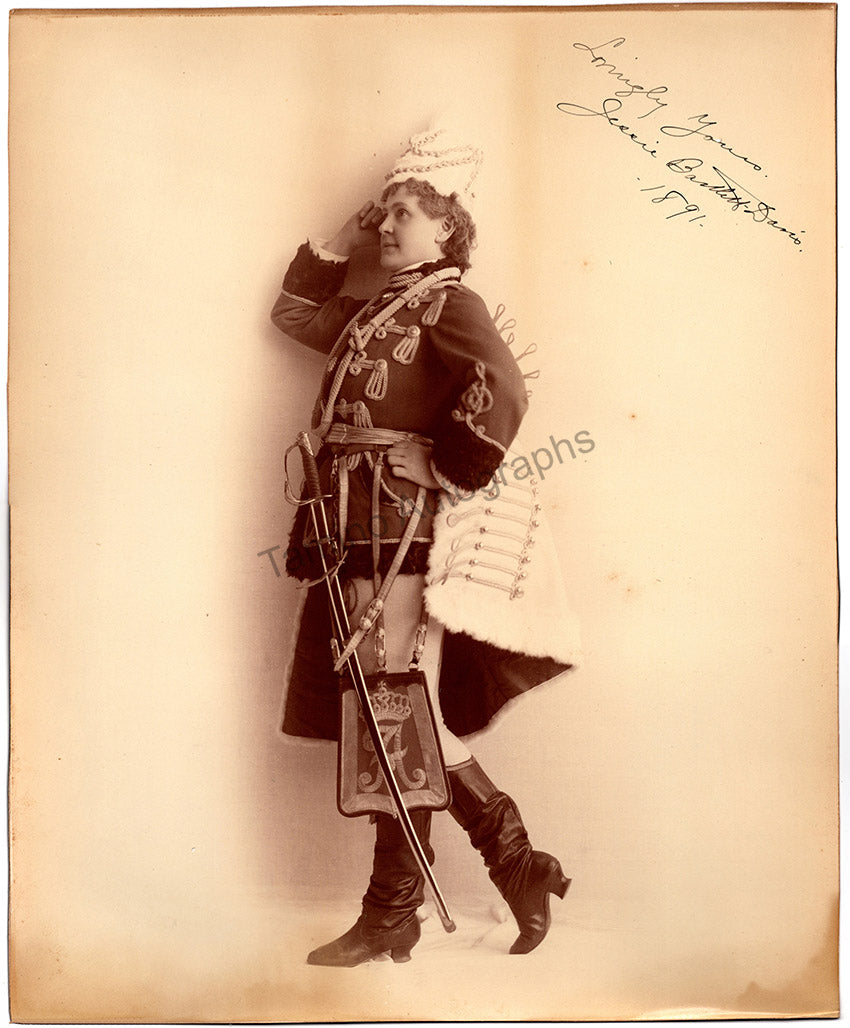 Extra-large beautiful photograph signed by her with a short sentiment, shown in role, dated in 1891; an original photograph by Max Platz, Chicago. Size is 14 x 17 inches, minor stains over the lower corners and over the top, otherwise in excellent condition.