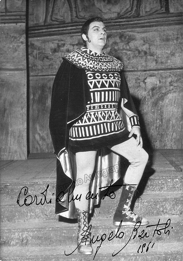 Italian tenor, father of Cecilia Bartoli, had a short career as a dramatic tenor who sang in both Italy and Holland, later was an opera chorister in Rome. Signed photograph, shown in role, dated in 1961. Size is 4 x 5.75 inches, in excellent condition.