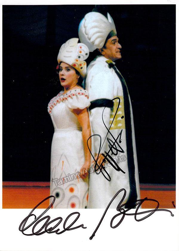 Star Italian mezzo-soprano (b.1966) and Italian bass-baritone (b. 1941), double signed photo, shown in roles. Size is 5 x 7 inches, in excellent condition.