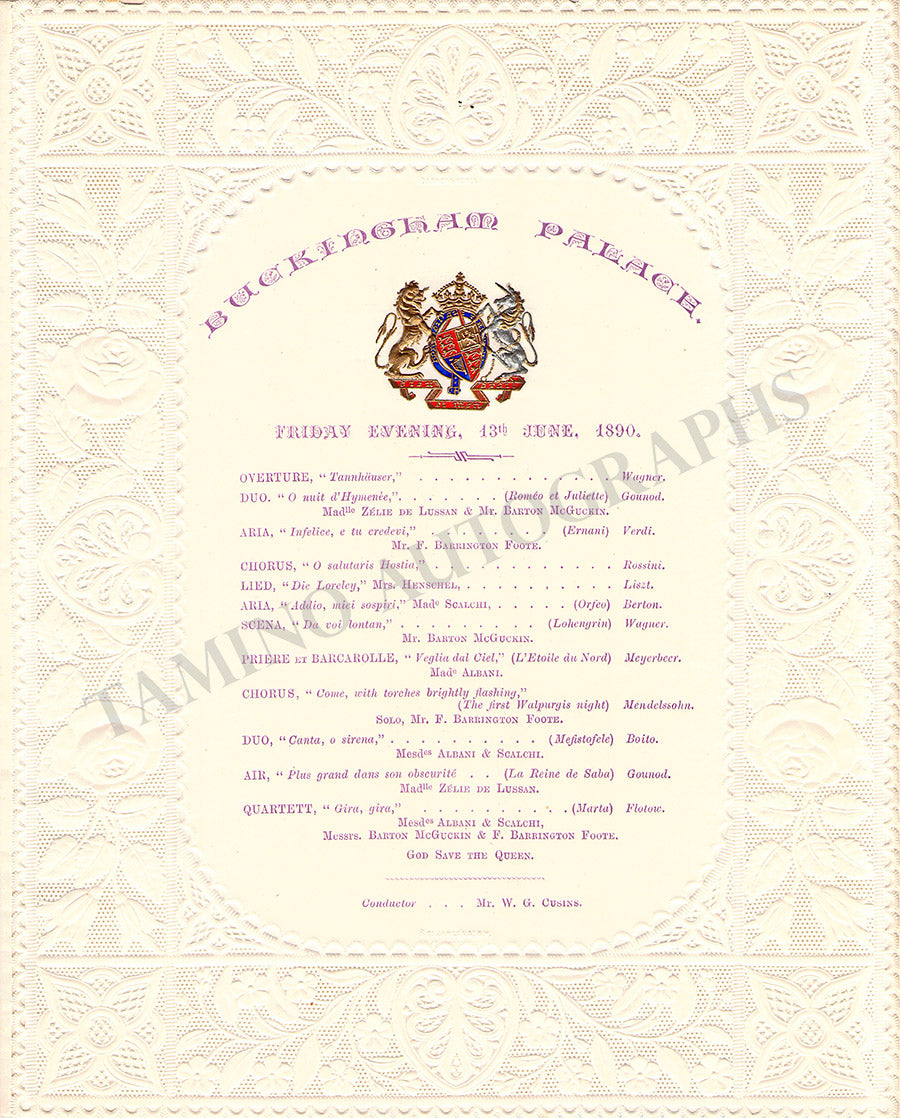 Beautifully embossed program for a concert on June 13, 1890, at Buckingham Palace, London, performed by star opera singers Zelie de Lussan, Emma Albani, Barton McGuckin, and others.