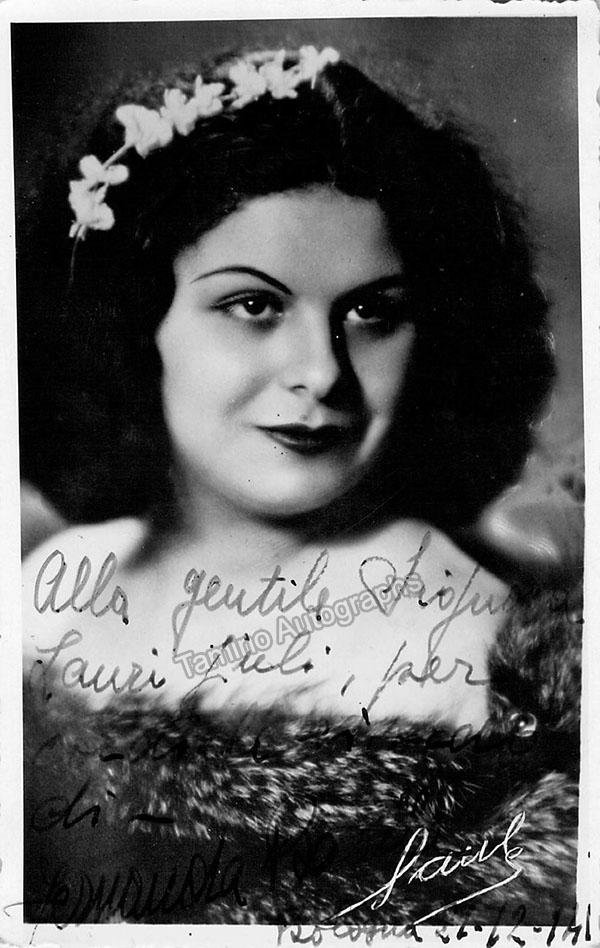 Italian soprano, signed postcard photograph, shown in role, inscribed in Bologna, dated in 1941. Printed signature of photographer in the front. Size is 3.25 x 5.25 inches, small crease on bottom left, otherwise in very good condition. Rare!