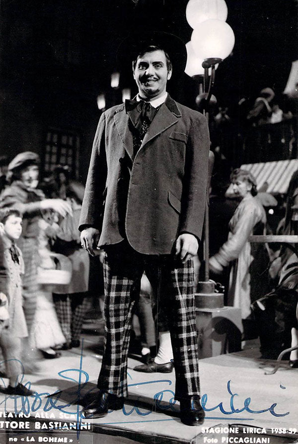 Set of 1 3.5 x 5.25 inch signed photograph, shown as Marcello in Puccini's La Boheme, photo by Piccagliani, La Scala Milan in excellent condition, along with an autograph letter signed, 3 pages of a folded 4 page 5.5 x 7.5 inch document, dated in Bologna in 1951, written in Italian and sold untranslated. Small creases and folds on letter, otherwise in very good condition. Not sold separately.