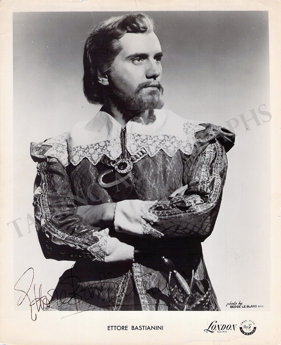 Gorgeous black-and-white promo photograph by London Records signed by Bastianini shown as Enrico Ashton in Donizetti's opera Lucia di Lammermoor. Size is 8 x 9.9 inches, in excellent condition.