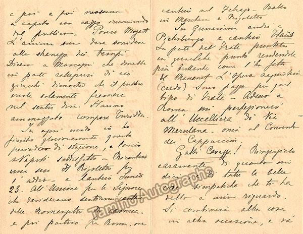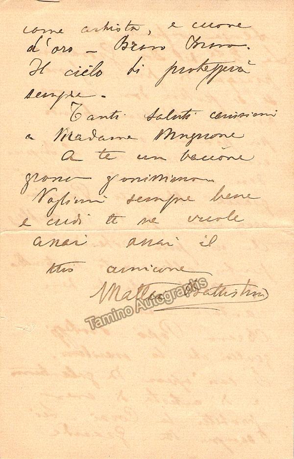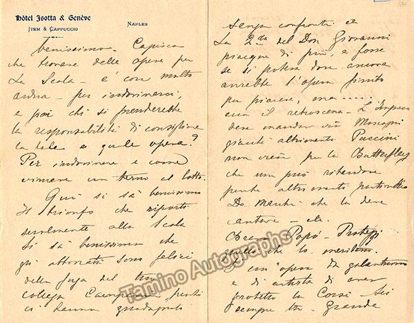 Italian baritone (1856-1928), autograph letter signed, to Italian opera conductor Leopoldo Mugnone, written on the stationary of the Hotel Isotta and Geneve, Naples. Written in Italian, sold untranslated. 7 pages of text on four folded pages, size of each page is 5.25 x 8 inches, in excellent condition.