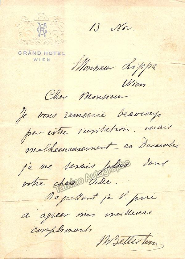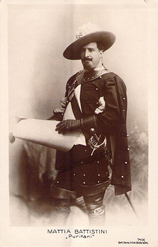 Italian baritone (1856-1928), known as the King of Baritones in his time. Lot of 1 autograph letter signed, 1 Autograph note signed, and 3 unsigned photos.  Both the Autograph letter and Autograph Note are both written in French on the letterhead of the Grand Hotel, Vienna on a single 5x 7 inch page, with slight bends on the page but in otherwise good condition, sold untranslated. Two of the photos are as himself, each on a 3.5 x 5.5 inch postcard, the third shows him in role in Bellini's I Puritani, on a 3.25 x 5.25 inch postcard, all are in excellent condition. Not sold separately.