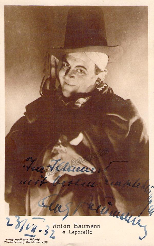 German bass (1880-1941), signed photo postcard, shown as Leporello in Mozart's Don Giovanni, dated in 1932. Inscribed. Photo by Musikhaus Pasold, Vienna. Size is 3.4 x 5.3 inches, in excellent condition.