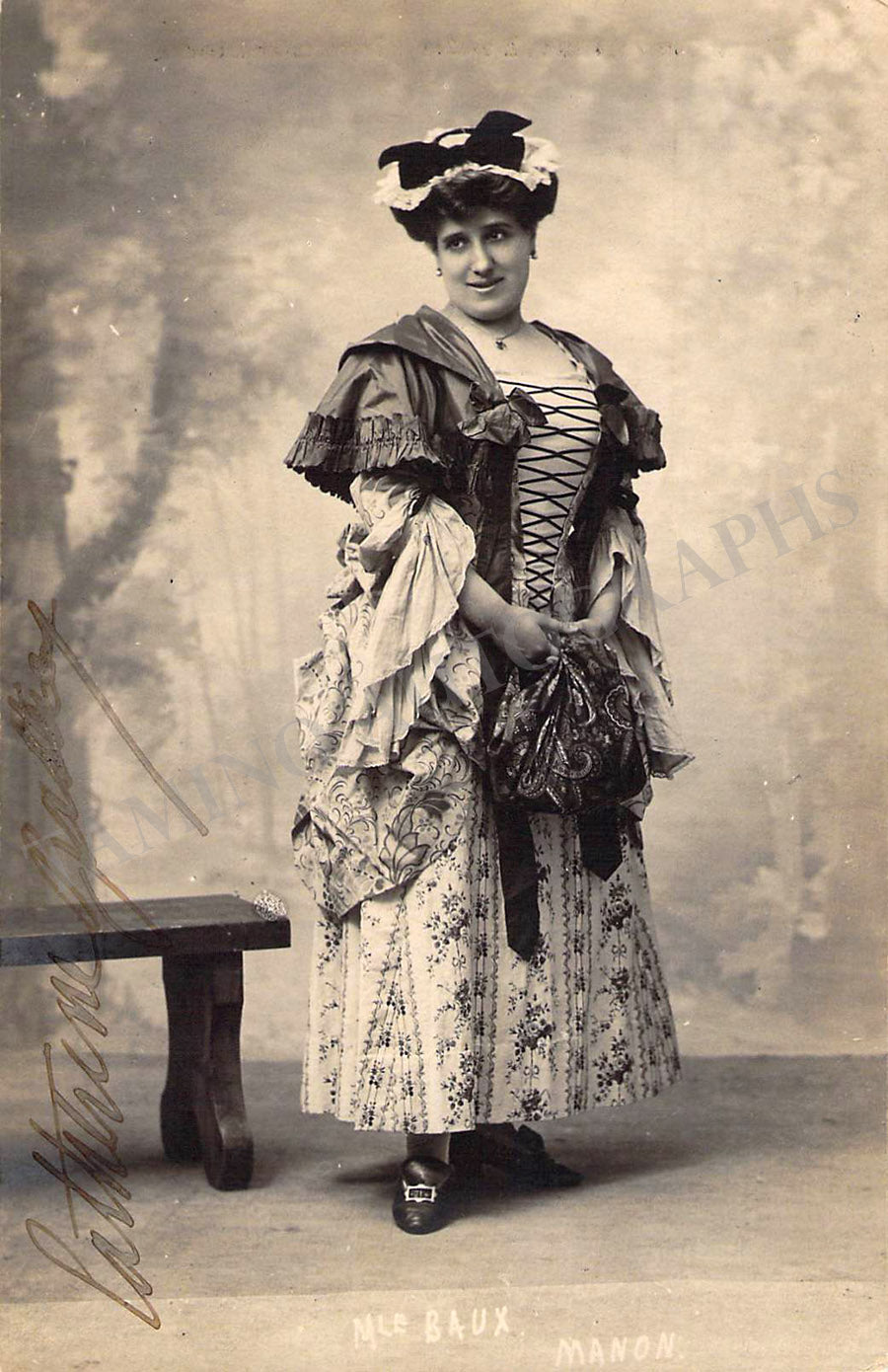 French soprano (1878-1955), signed postcard photograph, shown in the title role of Massenet's Manon. Photo by Wagener-Geraerts, Brussels. Size is 3.5 x 5.5 inches, in excellent condition.