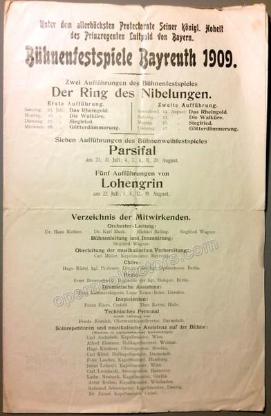 Bayreuth Festival 1909. Festival program. Der Ring des Nibelungen, Parsifal and Lohengrin. Conductors: Hans Richter, Karl Muck, Michael Balling and Siegfried Wagner. Complete details of all all performances, 4 pages, 8.25 x 13 inches, in very good condition.