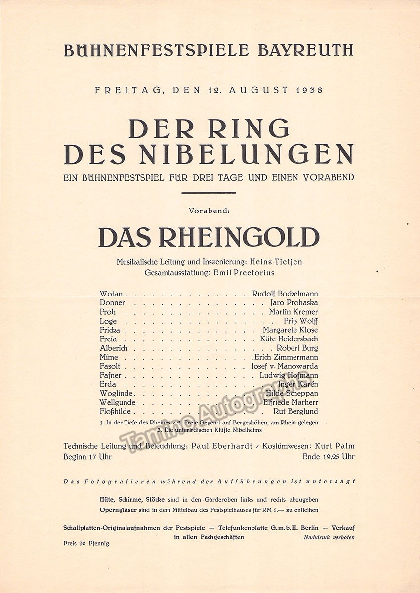 August 12th, 1938, Heinz Tietjen conducting, with Rudolf Bockelmann, Jaro Prohaska, Martin Kremer, Fritz Wolff, Margarete Klose, Erich Zimmermann, Josef von Manowarda, Ludwig Hofmann, 34 x 21 cm, in very good condition.