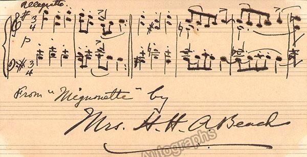 American composer (1867-1944), who was also a pianist and one of the first successful female composers. Her ¨Gaelic¨ symphony premiered in 1896, was the first symphony composed and published by an American woman. Autograph music quote signed, with 6 bars from “Mignonette”, a piano piece from 1922. Size is 6.25 x 3.25 inches, in excellent condition.