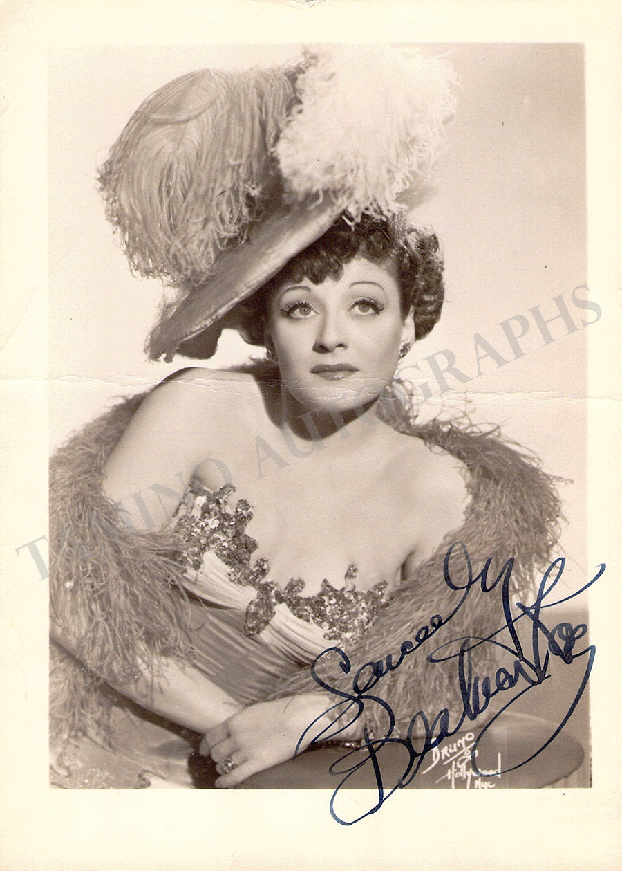 Black-and-white photograph signed by her with a short sentiment. Size is 4.9 x 6.8 inches, big crease across the center (not affecting the signature), in very good condition.