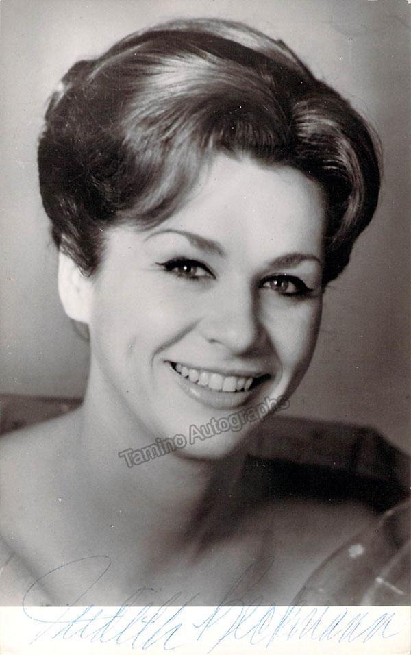 American soprano (b. 1935), signed postcard photograph, shown as herself. Photo by Fayer photo studio, Vienna. Size is 3.5 x 5.5 inches, mounting traces on verso, otherwise in excellent condition.