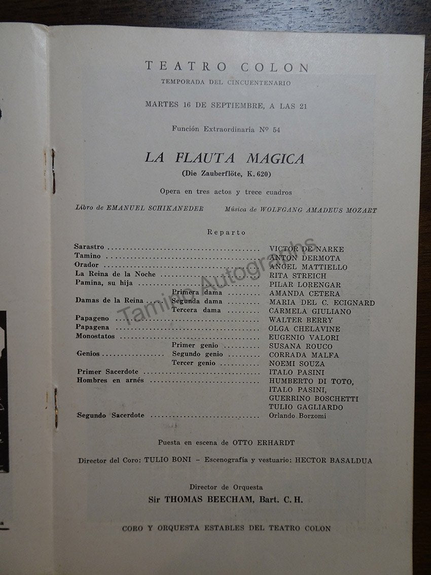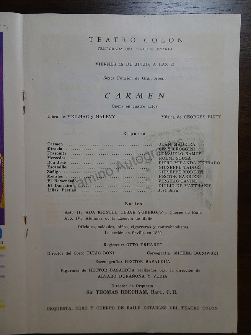 Group of 6 full programs for opera performances at Teatro Colon in Buenos Aires, Argentina, with Thomas Beecham conducting, all from 1958. Full programs, with all pages and covers, each one is 6 x 9 inches, in very good condition.