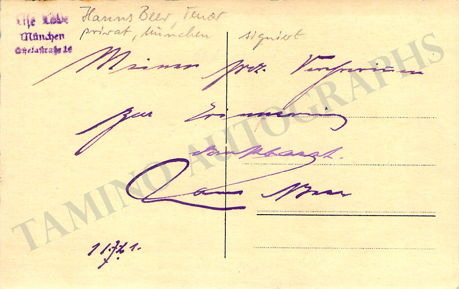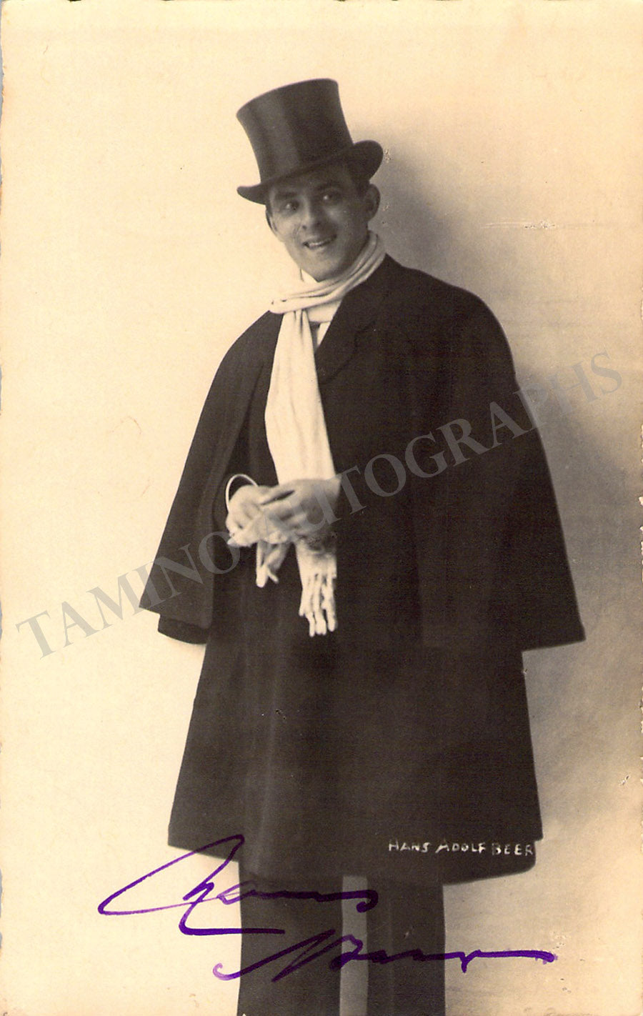 German tenor (1890-?), signed postcard photograph, shown most likely in role, signed both on front and on verso with inscription, dated in 1921. Stamped on verso by photographer. Size is 3.5 x 5.5 inches, in excellent condition.