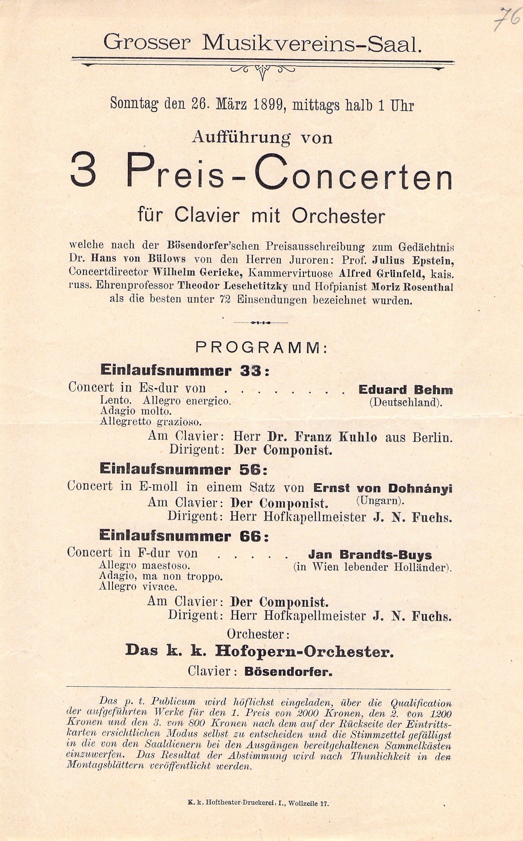 Printed program (unsigned) for a concert by Eduard Behm, Ernst von Dohnanyi, and Jan Brandts-Buys performing their own piano concertos in Vienna, March 26, 1899, under the baton of J. N. Fuchs.