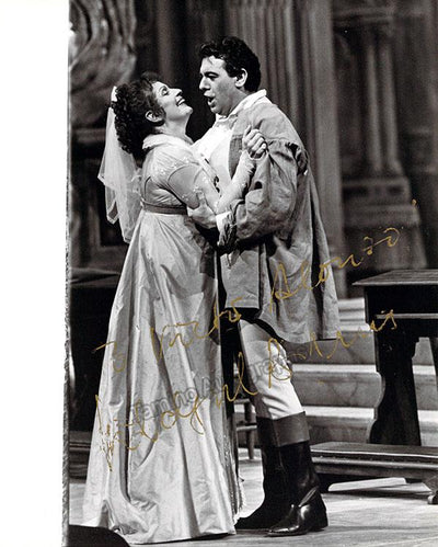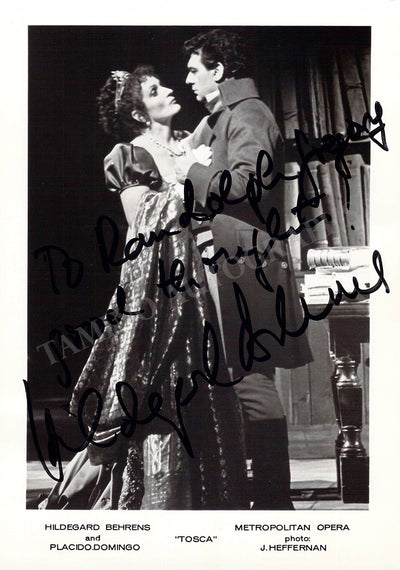 Signed photograph, shown in title role of Puccini's Tosca with Placido Domingo at the Metropolitan Opera, inscriibed. Photo by James Heffenan, Metropolitan Opera, New York. Size is 5 x 7 inches, in excellent condition.