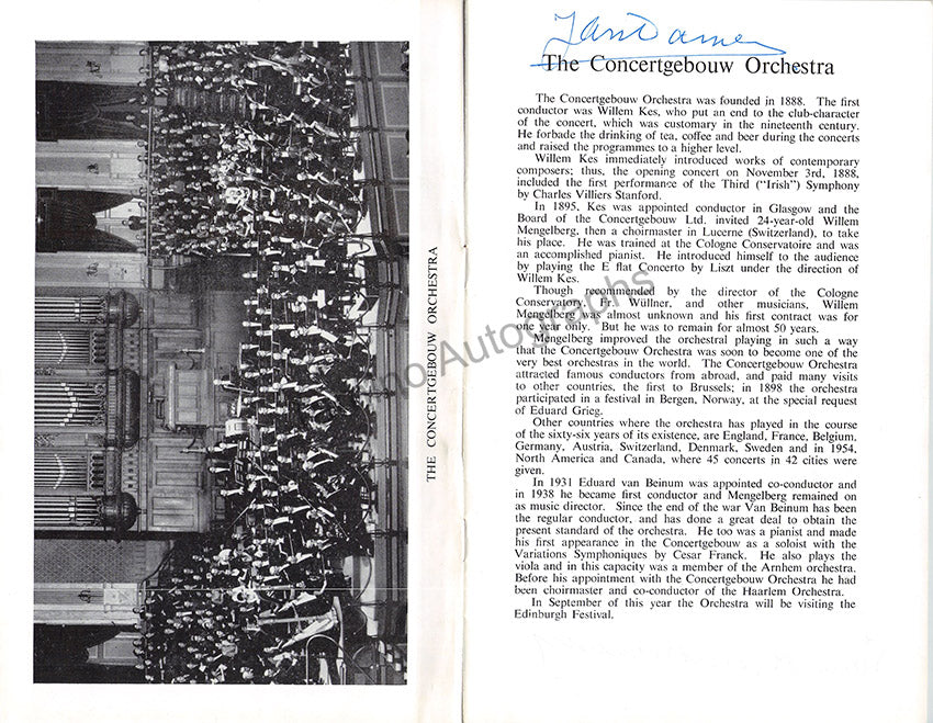 Program for a performance of the Concertgebouw Orchestra at the Royal Festival Hall, London, on March 26th, 1957, under the baton of the Dutch conductor, signed by him on his photo page, plus one unidentified signature on top of the orchestra bio page.