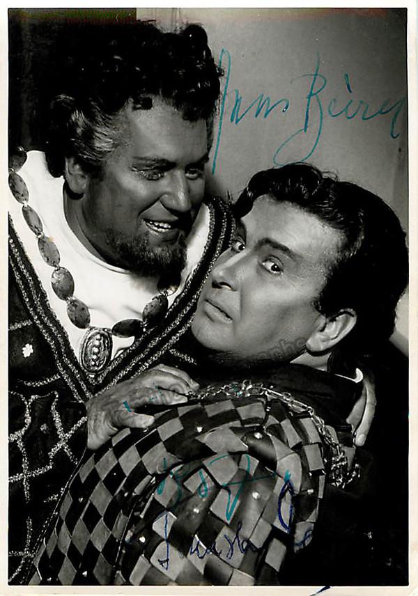 Hans Beirer, Austrian tenor (1911-1993) and Tomislav Neralic, Croatian bass-baritone (b.1917). Signed photo postcard shown in role in Othello; Beirer as Othello and Neralic as Lago. Stamped on verso by photographer Ilse Buhs, Berlin. Size is 3.5 x 5.5 inches