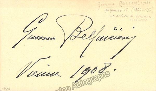 Italian soprano (1864-1950) who performed the main soprano role in the world premiere of Cavalleria Rusticana (Santuzza) and the title role in the world premiere of Fedora. Signed album page, dated in Venice in 1908. Bold handwriting and signature. Size is 2.5 x 4.25 inches, in excellent condition.