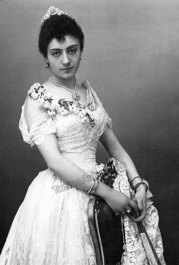 Italian soprano (1864-1950) who performed the main soprano role in the world premiere of Cavalleria Rusticana (Santuzza) and the title role in the world premiere of Fedora. Check signed by her with bold handwriting and signature, size is 3.75 x 8.75 inches, in very good condition. ALSO INCLUDED: unsigned photograph, shown most likely as Fedora, size is 4 x 5.75 inches, in excellent condition. Not sold separately.