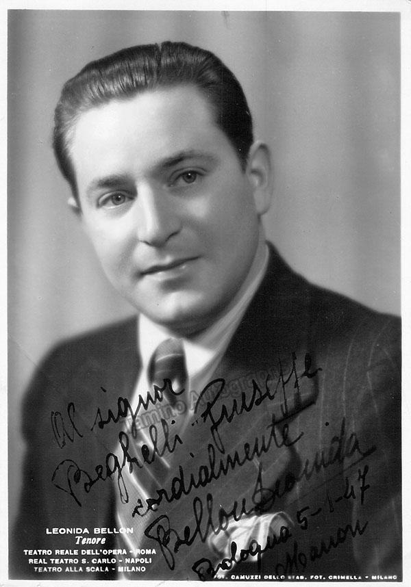 Italian tenor (1905(?) - 1987(?)), signed photo, shown as himself, signed in Bologna, dated in 1947. Inscribed with short sentiment. Photo by M. Camuzzi, Milan. Size is 4.1 x 5.75 inches, in excellent condition.