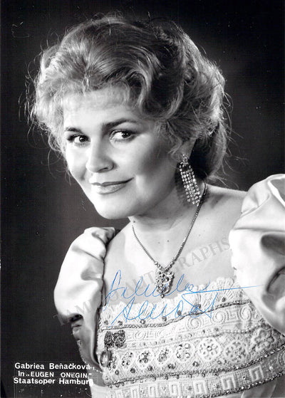 Beautiful black-and-white photograph signed by her, shown as Tatyana in Tchaikovsky's opera Eugene Onegin; ink-stamped on verso by photographer Hans-Joachim Lieske (Hamburg). Size is 4.1 x 5.75 inches, in excellent condition.