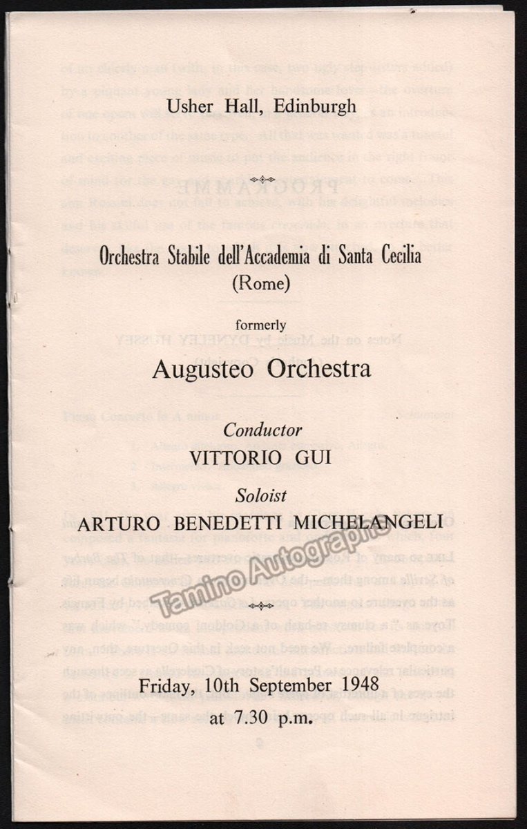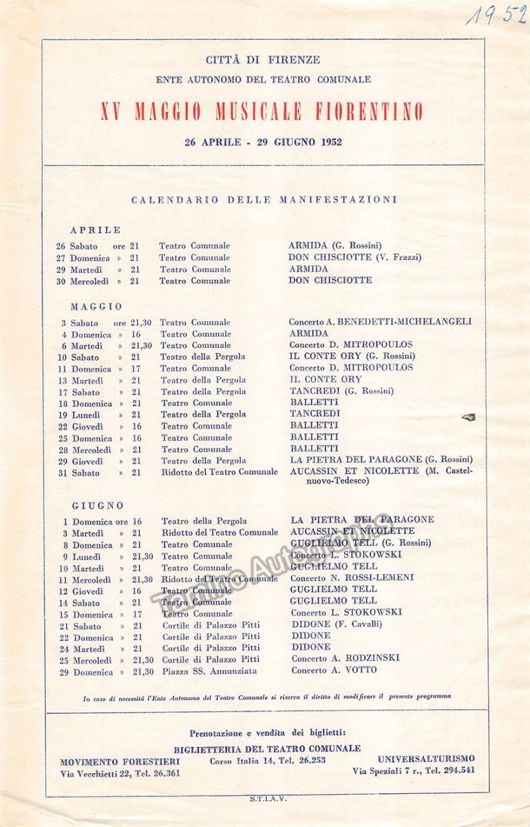 Group of 7 full programs, all with Arturo Benedetti Michelangeli performing in concert, various venues and sizes. Programs are: 1) Teatro Adriano, Rome, 1943, 2) Konzerthaus Gesellschaft, Vienna, 1948, 3) Edinburgh International Festival, 1948, 4) Teatro Colón, Bs Aires, 1948, 5) Maggio Musicale Fiorentino, 1951, 6) Maggio Musicale Fiorentino, playbill announcement 1952, 7) Teatro Comunale, Florence, Italy 1961.