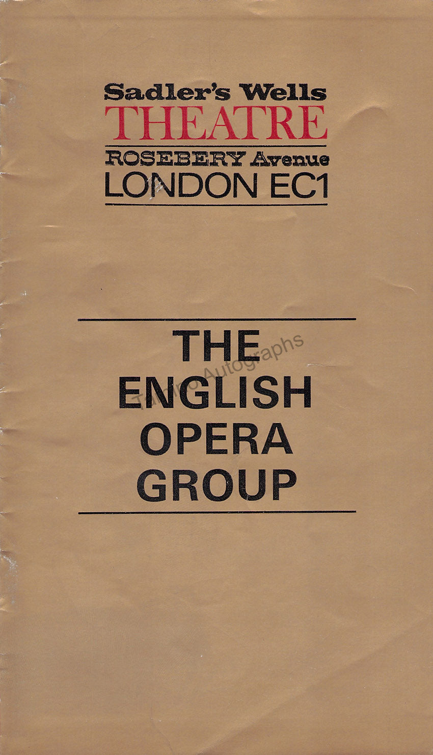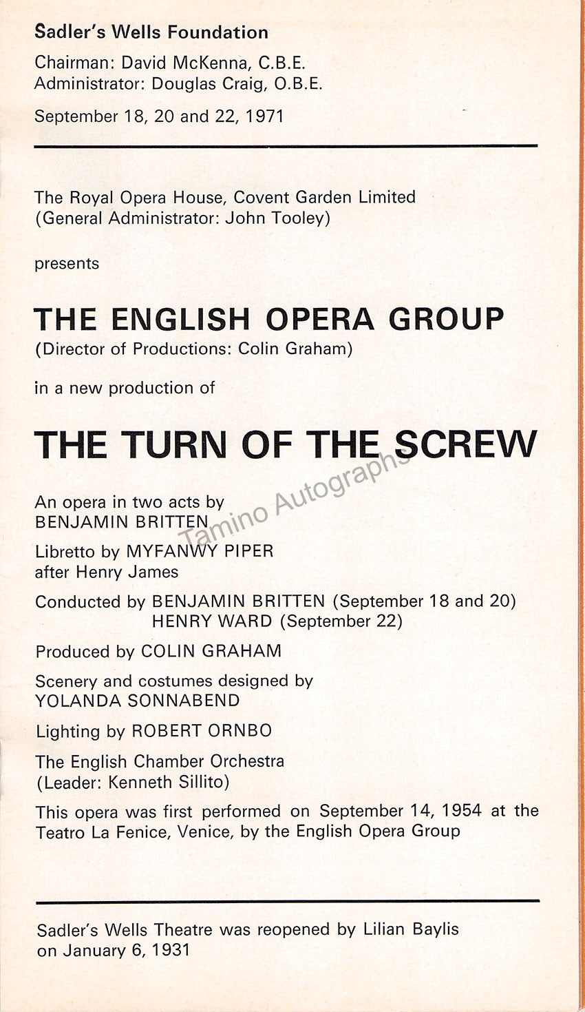 Program for a performance of Benjamin Britten's opera "The Turn of the Screw" at Sadler's Wells Theater, London, on September 18th, 20th, and 22nd, 1971, conducted by the composer himself, and signed by him, and artists Peter Pears, Catherine Wilson, Elizabeth Gale, Sylvia Fisher, Rae Woodland, and Colin Graham (producer).