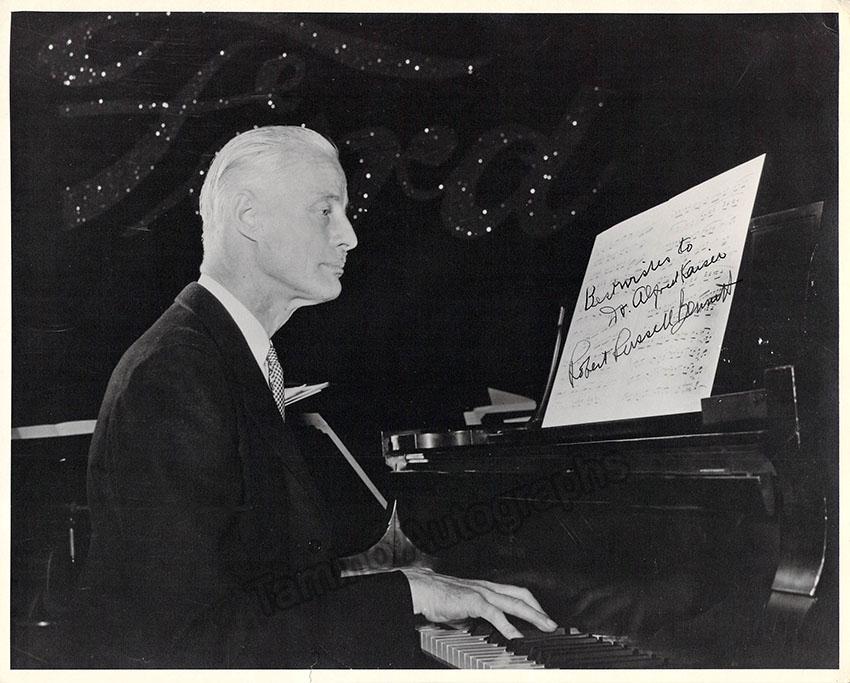 Wonderful black and white photograph (double-weight photo paper) shown at the piano, signed and inscribed by him with a short sentiment. Size is 9.75 x 7.9 inches, small crack over the lower border, minor stains, otherwise in excellent condition.