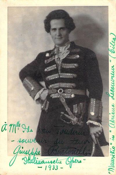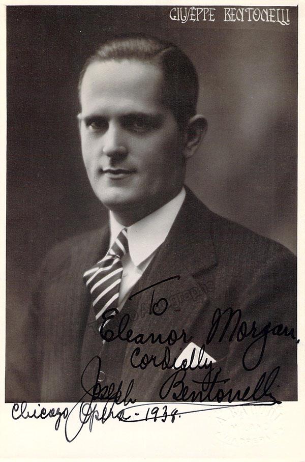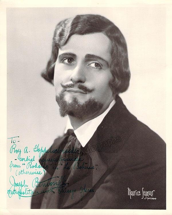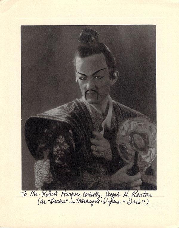 Signed photo, shown in role in Mascagni's Iris. Inscribed and signed as 'Joseph Benton'. Blind stamped by photographer T. Santacroce, Milan. Size is 8.25 x 10.5 inches, in excellent condition.