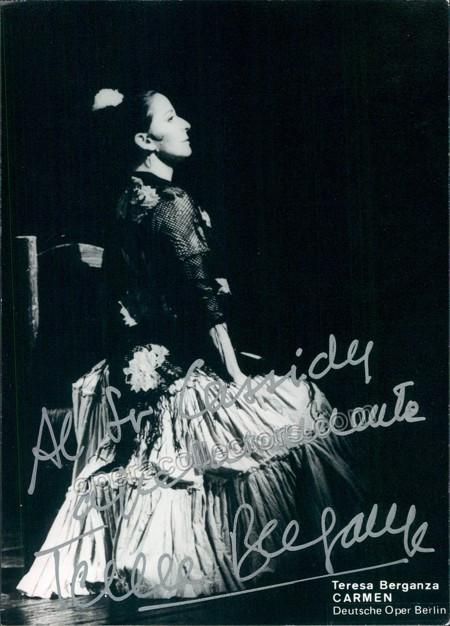 Teresa Berganza is a Spanish mezzo-soprano. She has been one of the most acclaimed opera singers over three decades. Signed photo as Carmen at Deutsche Oper in Berlin, 4 x 5.75 inches, inscribed.