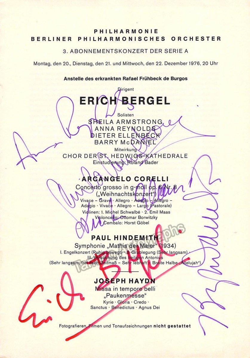 Concert with the Berlin Philharmonic Orchestra, also signed by soloists Sheila Armstrong, Anna Reynolds, Dieter Ellenbeck, Barry McDaniel. Berlin, December 20th, 1976, music by Corelli, Hindemith, Haydn "Paukenmesse". Size is 16.5 cm x 24 cm, 8 pages.