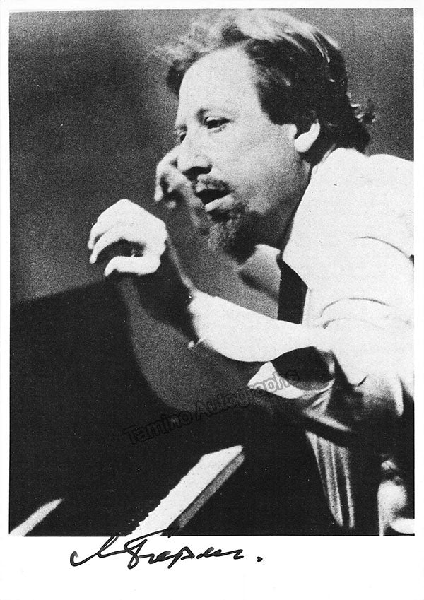 Fine half-tone photograph signed by him, shown in rehearsal, with pencil markings on verso indicating the photo was taken at the Musikverein in Vienna, on February 27th, 1985.  Size is 5 x 7 inches, in excellent condition.
