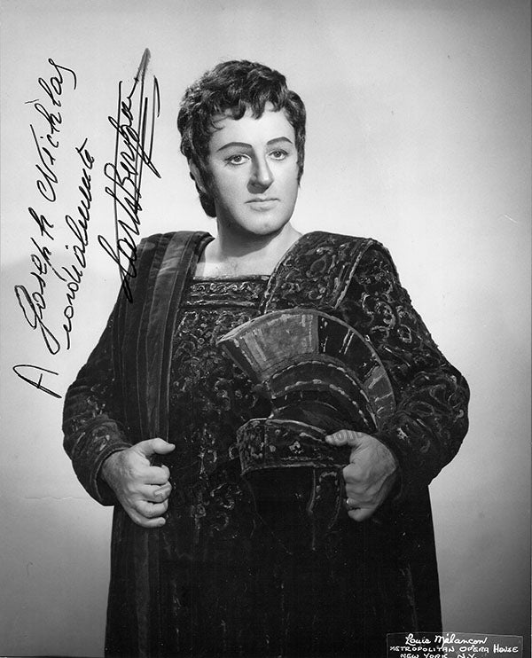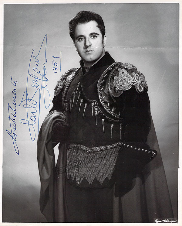 Signed photograph, shown in role, dated in 1959. Printed signature on front of photographer Louis Melancon, Metropolitan Opera, New York. Size is 8 x 10 inches, several creases at the top and middle of the photo, otherwise in very good condition.