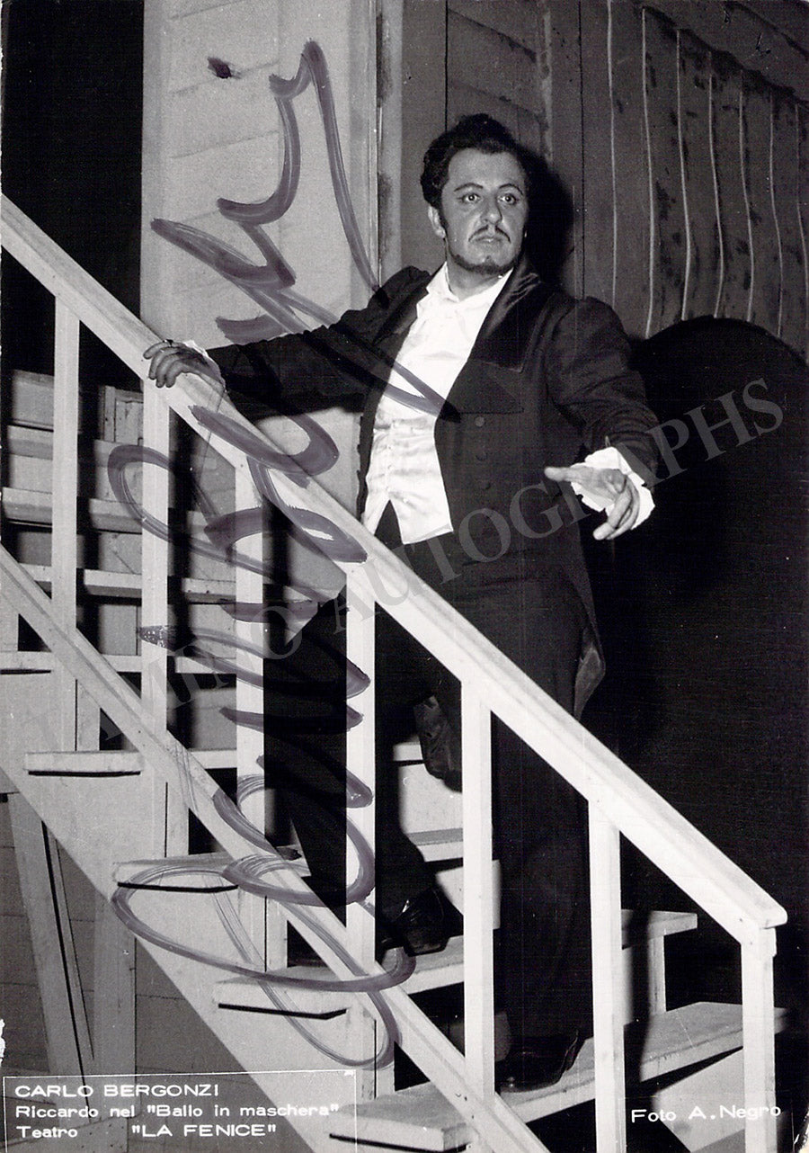 Fine black-and-white photograph signed by him, shown as Riccardo in Verdi's Un Ballo in Maschera at Teatro La Fenice, Venice. Size is 4 x 5.75 inches, in excellent condition.