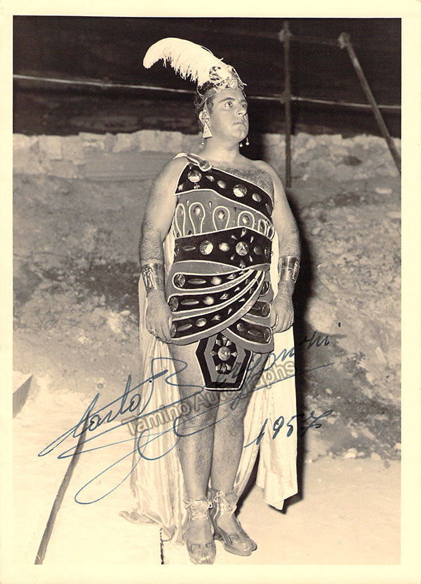 Nice black-and-white promo photograph signed by him, shown as Radames in a production of Verdi's opera Aida at Teatro Colon (Buenos Aires). Size is 3.8 x 5.8 inches, in excellent condition.