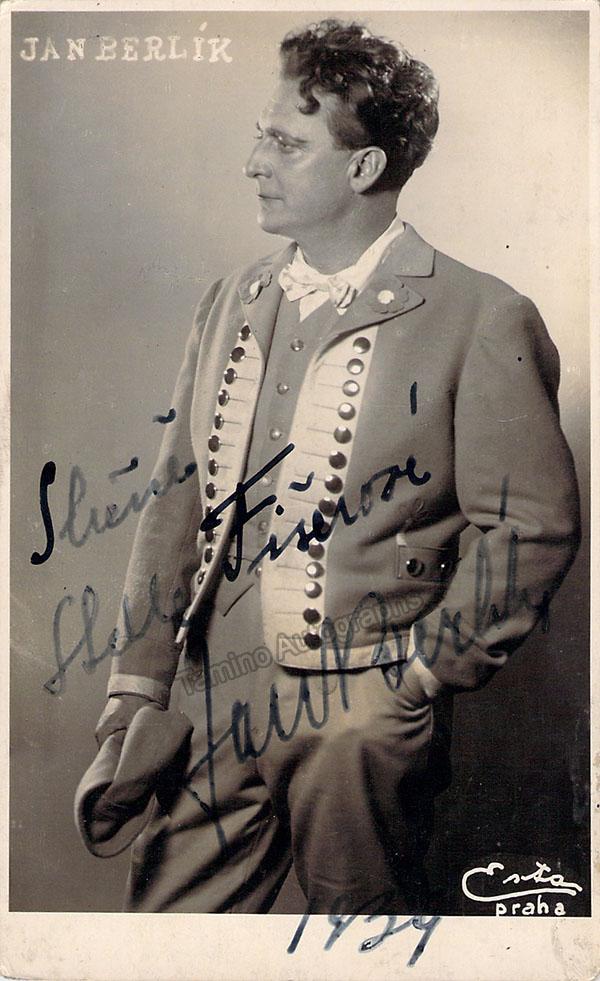 Czech tenor (1892-1972), signed photo postcard, shown as Jenik in Smetena's Bartered Bride, dated in 1939. Blind stamped by photographer on front. Size is 3.25 x 5.25 inches, in good condition.