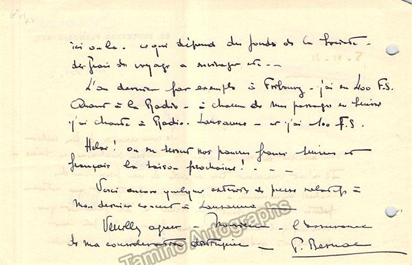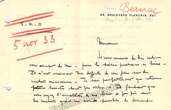 Bernac, Pierre - Autograph Letter Signed 1933 - Tamino Bernac, Pierre - Autograph Letter Signed 1933 - Tamino
