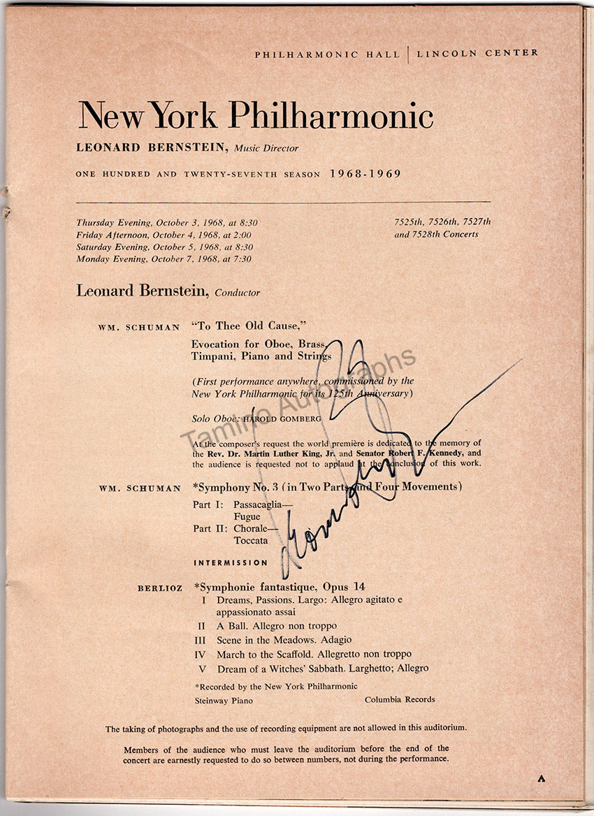 Program for a performance of the New York Philharmonic conducted by the star American conductor at the Philharmonic Hall, New York, in October 1968, signed by him on the program page.  Size is 8 x 11 inches, 52 pages + covers, evenly distributed rust, otherwise in very good condition.