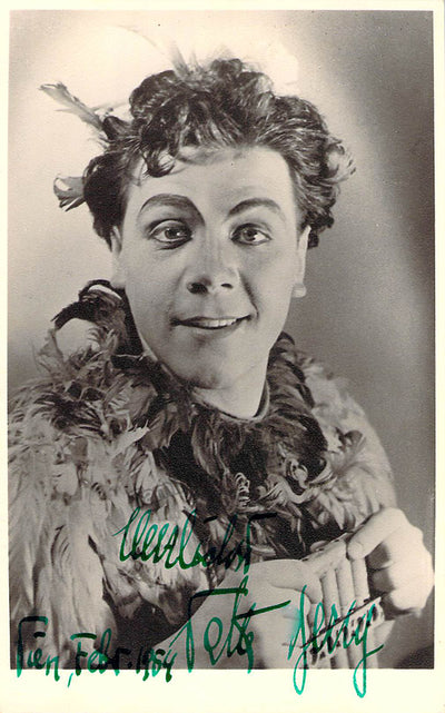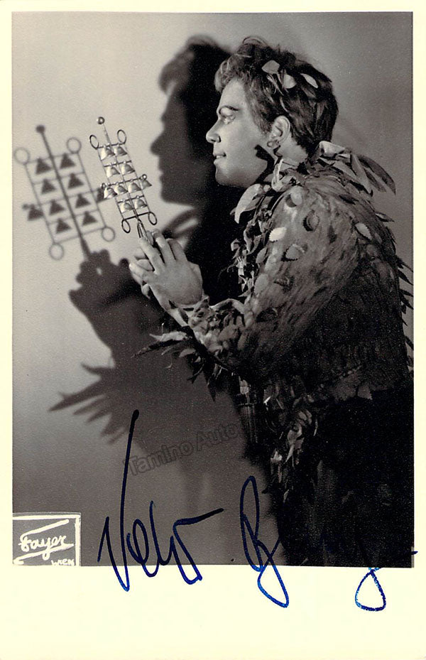 Signed photograph, shown as Papageno in Mozart's Die Zauberflote, dated in Vienna in 1954. Size is 3.25 x 5.25 inches, in excellent condition.