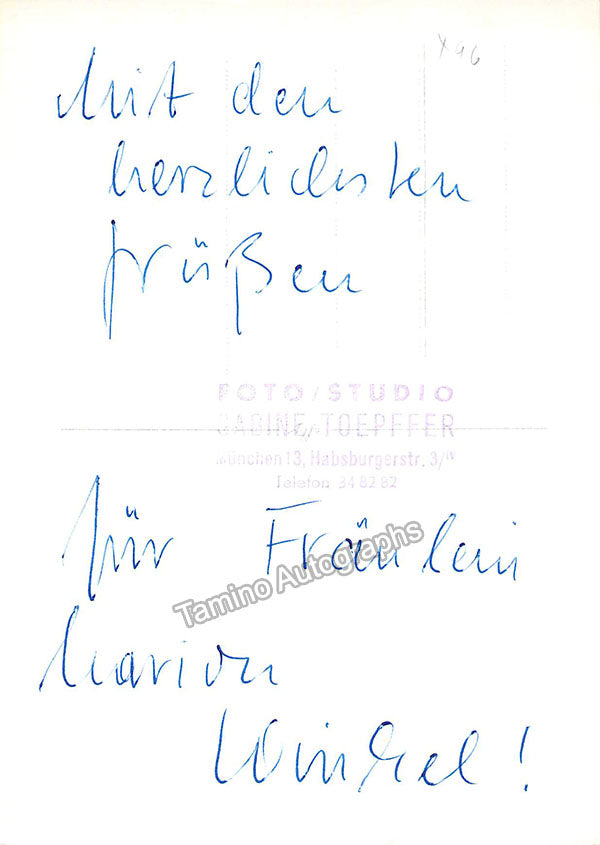 Signed postcard photograph, shown as herself. Signed on front with additional inscription on verso. Stamped on verso by photographer Sabine Toepffer, Munich. Size is 4 x 5.75 inches, in excellent condition.
